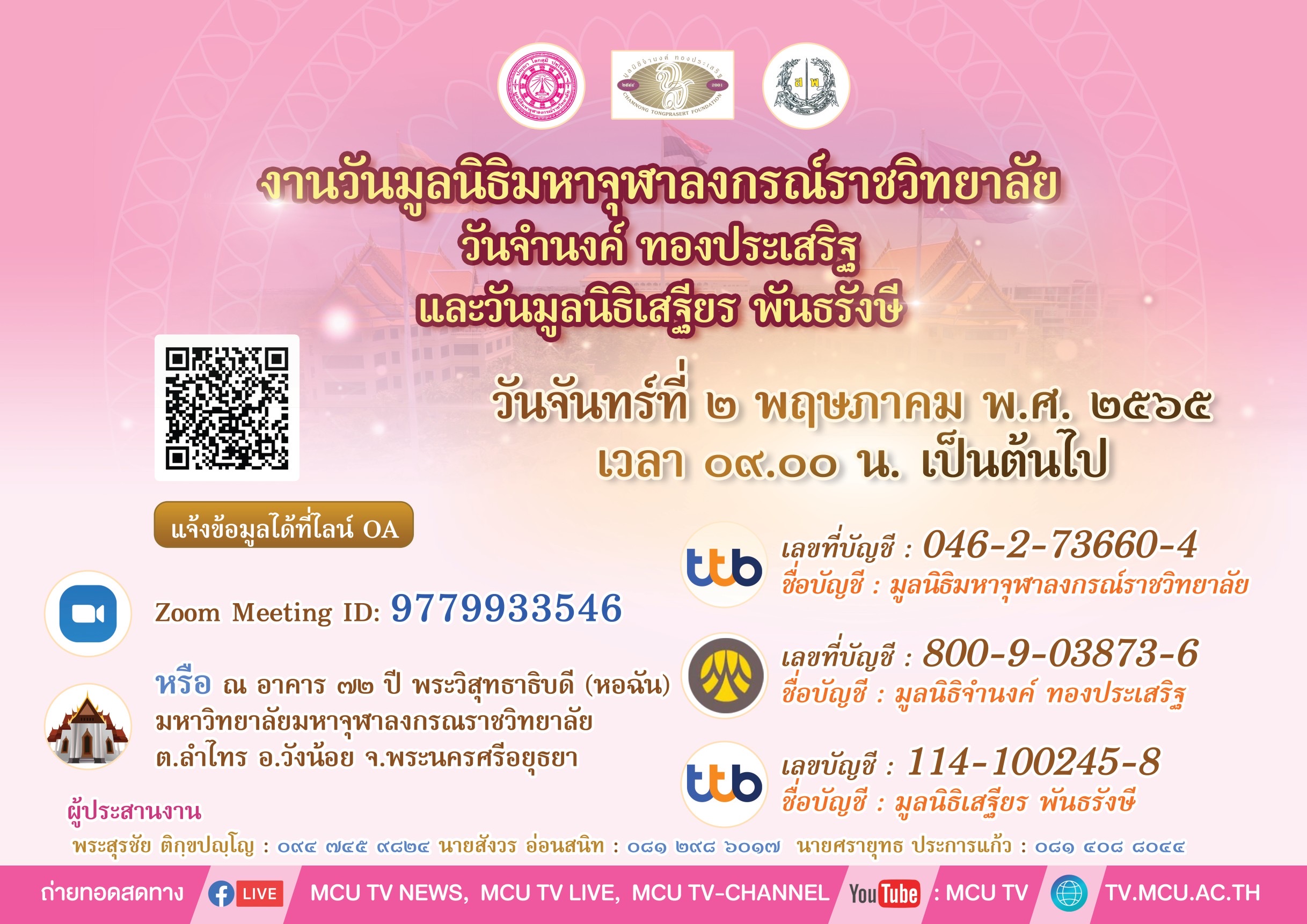 ขอเชิญผู้บริหาร คณาจารย์ เจ้าหน้าที่ และนิสิต รวมถึงศิษย์เก่าทุกท่าน เข้าร่วมงานวันมูลนิธิมหาจุฬาลงกรณ์ราชวิทยาลัย วันจำนงค์ ทองประเสริฐ และ วันมูลนิธิเสฐียร พันธรังษี ในวันจันทร์ที่ ๒ พฤษภาคม พ.ศ. ๒๕๖๕ ณ อาคาร ๗๒ ปี พระวิสุทธาธิบดี (หอฉัน) มจร หรือผ่านทางระบบ Zoom Meeting ID: 977 993 3546 หรือ สามารถชมถ่ายทอดสดผ่านทาง MCU TV Live, MCU TV – Channel