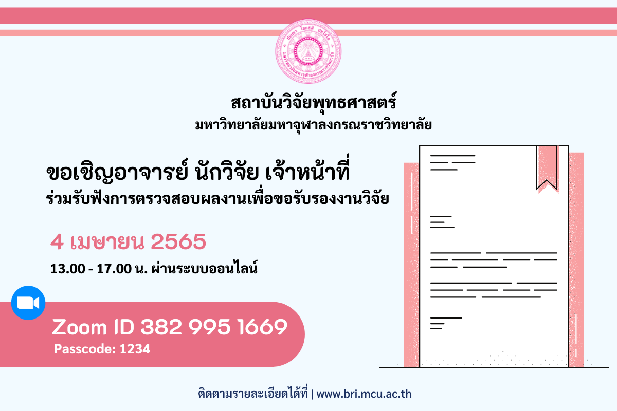 วันที่ 4 เมษายน 2565 เวลา 13.00 น. ผู้อำนวยการสถาบันวิจัยพุทธศาสตร์นัดประชุมตรวจการขอรับรองงานวิจัยเพื่อขอตำแหน่งทางวิชาการผ่านระบบบออนไลน์ นักวิจัยที่ส่งรายงานการวิจัยมาขอตำแหน่งทางวิชาการ ขอเชิญเข้ารับฟังในวันดังกล่าว | Zoom ID: 382 995 1669 Passcode: 1234 -> https://zoom.us/j/3829951669