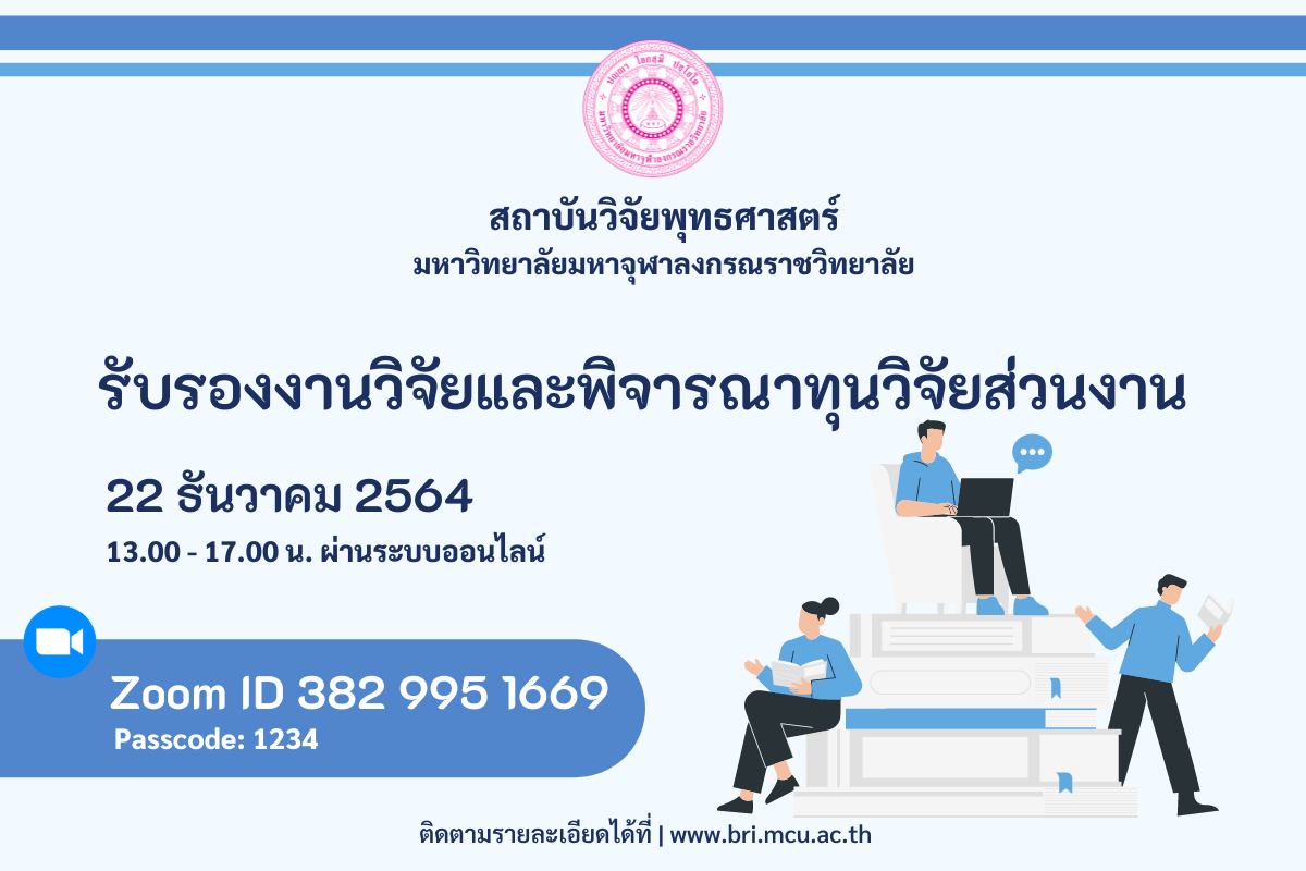 สถาบันวิจัยพุทธศาสตร์ มหาวิทยาลัยมหาจุฬาลงกรณราชวิทยาลัย แจ้งรับรองงานวิจัยและพิจารณาทุนวิจัยส่วนงาน | 22 ธันวาคม 2564 เวลา 13.00 – 17.00 น. ผ่านระบบออนไลน์ | Zoom ID: 382 995 1669 Passcode: 1234 | https://zoom.us/j/3829951669