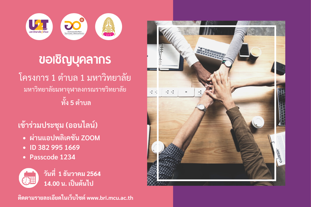 ขอเชิญบุคลากร โครงการ 1 ตำบล 1 มหาวิทยาลัย มหาวิทยาลัยมหาจุฬาลงกรณราชวิทยาลัย เข้าร่วมประชุม (ออนไลน์)