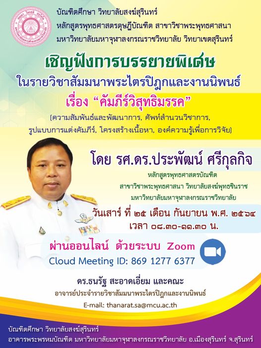 วันที่ 25 กันยายน พ.ศ.2564แจ้งนิสิต และท่านผู้สนใจร่วมรับฟังการบรรยายพิเศษเรื่อง “คัมภีร์วิสุทธิมรรค” โดย รศ.ดร.ประพัฒน์ ศรีกุลกิจ, ป.ธ.๙ ผ่าน Zoom Application ตาม ID ที่ปรากฎ