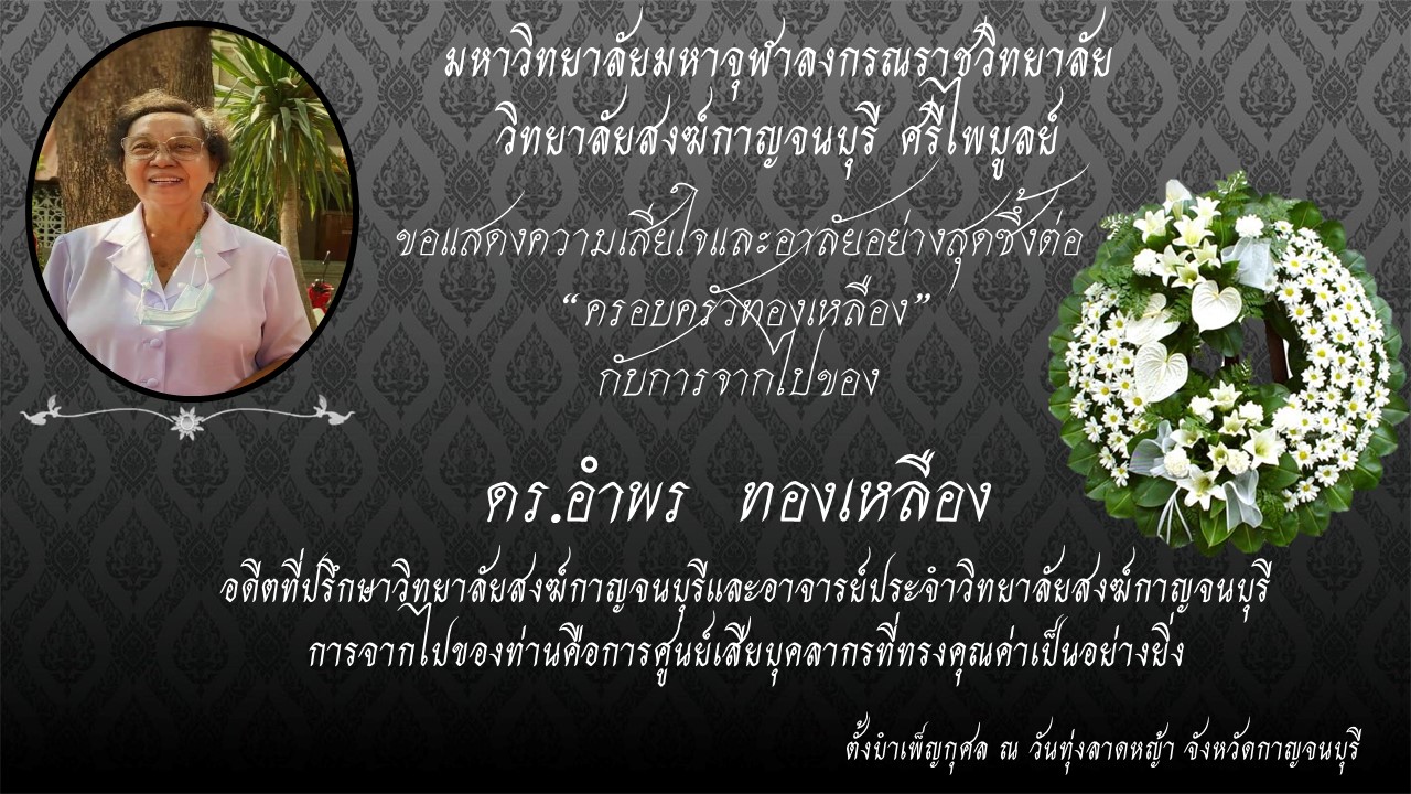 วิทยาลัยสงฆ์กาญจนบุรี ศรีไพบูลย์ ขอแสดงความเสียใจต่อครอบครัวและอาลัยอย่างสุดซึ้ง กับการจากไปของอาจารย์แม่ “ดร.อัมพร ทองเหลือง” อดีตที่ปรึกษาประจำวิทยาลัยสงฆ์กาญจนบุรี