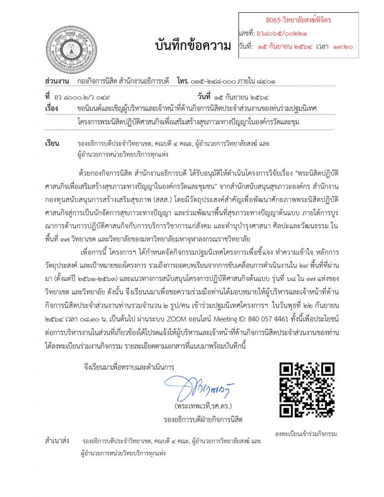 วันที่ ๑๗ กันยายน ๒๕๖๔ พระปราโมทย์ วาทโกวิโท,ดร.อาจารย์หลักสูตรสันติศึกษา มหาวิทยาลัยมหาจุฬาลงกรณราชวิทยาลัย (มจร) เลขานุการศูนย์ไกล่เกลี่ยข้อพิพาทภาคประชาชน มจร พัฒนาหลักสูตรระยะสั้นสันตินวัตกรรมหลักสูตรสันติศึกษา มจร เปิดเผยว่า ได้ร่วมรับฟังนโยบายการตรวจประเมินการปฏิบัติงานส่วนงานสนับสนุนการจัดการศึกษา ภายใต้หัวข้อ “ส่วนงานสนับสนุนการศึกษา : กลไกขับเคลื่อนองค์กรสู่เป้าหมาย” บรรยายและมอบนโยบายการทำงานโดย พระธรรมวัชรบัณฑิต, ศาสตราจารย์ ดร. อธิการบดีมหาวิทยาลัยมหาจุฬาลงกรณราชวิทยาลัย กล่าวประเด็นสำคัญว่า มหาวิทยาลัยมหาจุฬาลงกรณราชวิทยาลัย ๑๓๔ ปีทำให้สอดรับว่าความสำเร็จการทำงานโดยหน้าที่และเกื้อกูลพันธกิจส่วนใดขององค์กร