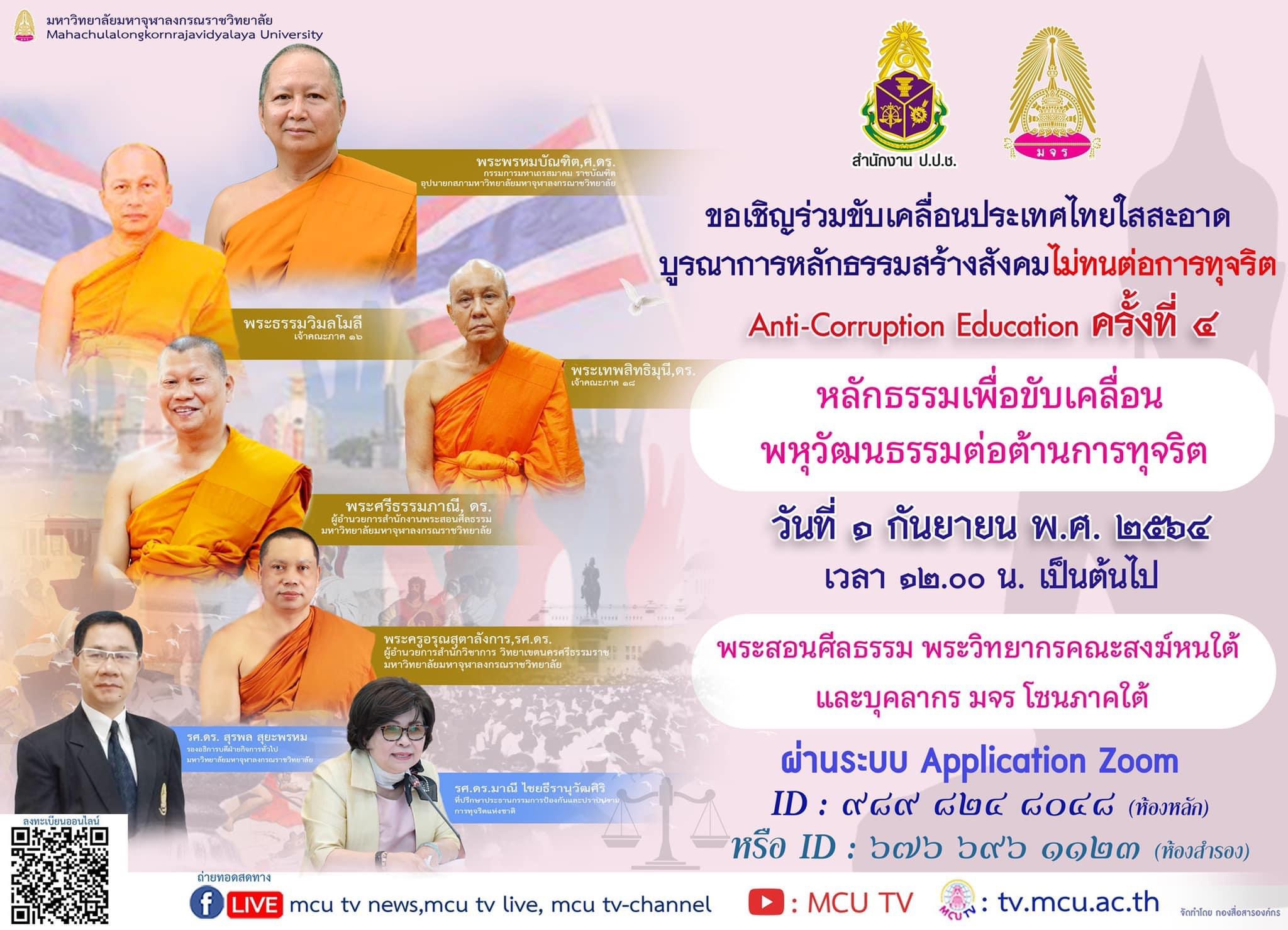 วันศุกร์ที่ ๓ เดือนกันยายน พ.ศ. ๒๕๖๔ เวลา ๑๓.๐๐ น. มหาวิทยาลัยมหาจุฬาลงกรณราชวิทยาลัย จัดโครงการบูรณาการแนวทางความร่วมมือทางศาสนาในการต่อต้านการทุจริต โดยการประยุกต์ หลักธรรมคำสอนกับหลักสูตรต้านทุจริตศึกษา : Anti-Corruption Education ผ่านระบบออนไลน์ (Application Zoom) ครั้งที่ ๕ (กลุ่มเป้าหมาย พระสังฆาธิการ พระสงฆ์ ตัวแทนผู้ประสานงาน พระสอนศีลธรรมและพระวิทยากร คณะสงฆ์หนตะวันออก และบุคลากร มจร โซนภาคตะวันออกเฉียงเหนือ)