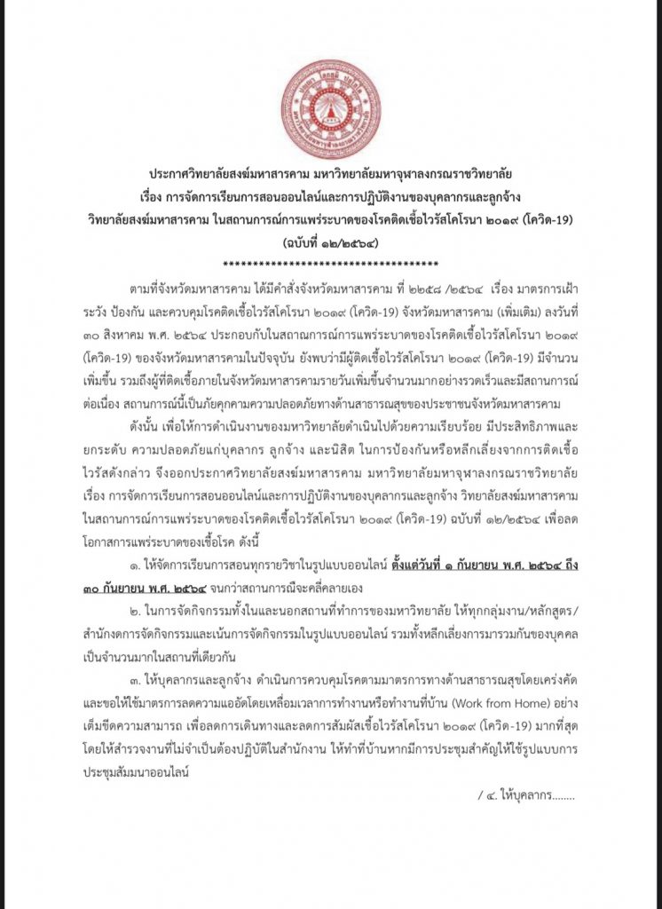The post ประกาศ การจัดการเรียนการสอนออนไลน์และการปฏิบัติงานของบุคลากรและลูกจ้าง วิทยาลัยสงฆ์มหาสารคาม ในสถานการณ์การแพร่ระบาดของ โรคติดต่อเชื้อไวรัสโคโรนา 2019(COVID-19) (ฉบับที่ ๑๒) ตั้งแต่วันที่ ๑ – ๓๐ กันยายน พ.ศ.๒๕๖๔ appeared first on วิทยาลัยสงฆ์มหาสารคาม.