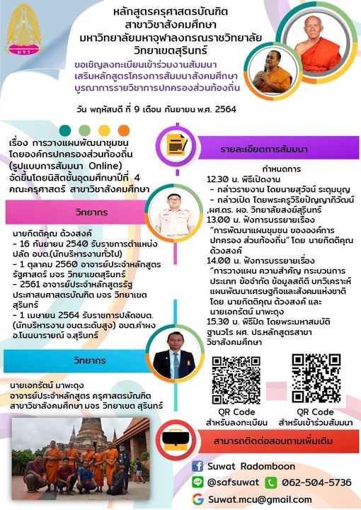 The post ขอเชิญร่วมโครงการสัมมนาสังคมศึกษา บูรณาการรายวิชาการปกครองส่วนท้องถิ่น appeared first on มหาวิทยาลัยมหาจุฬาลงกรณราชวิทยาลัย วิทยาเขตสุรินทร์.