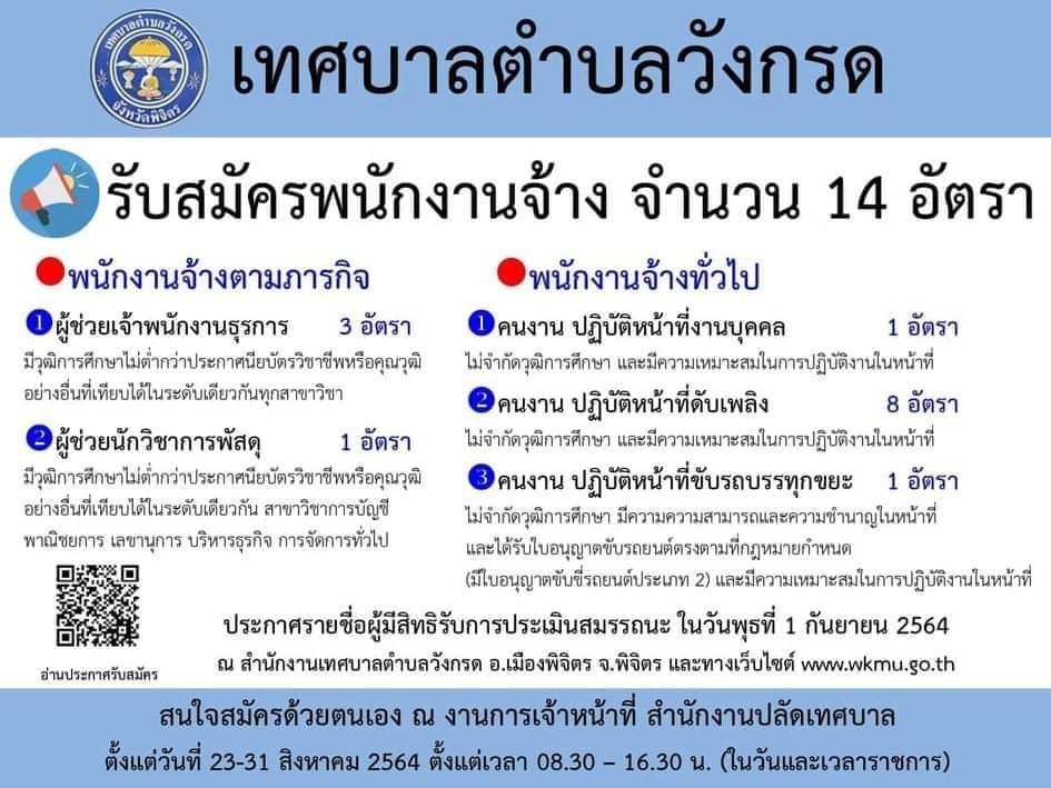 เทศบาลตำบลวังกรดเปิดรับสมัครพนักงาน 14 ตำแหน่ง