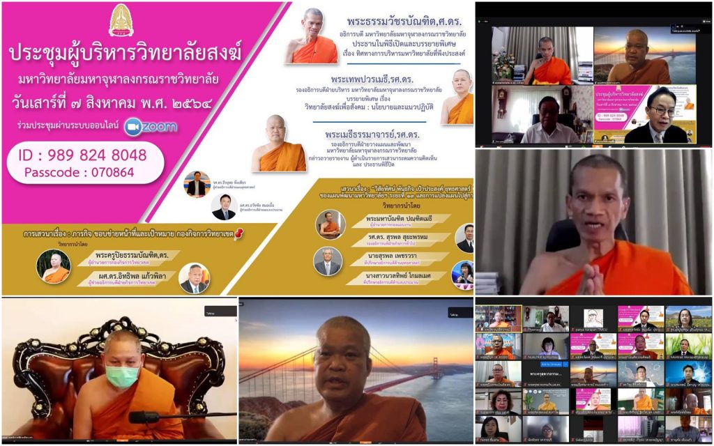วันเสาร์ที่ ๗ สิงหาคม พ.ศ.๒๕๖๔ คณะผู้บริหาร คณาจารย์และเจ้าหน้าที่ วิทยาลัยสงฆ์มหาสารคาม มหาวิทยาลัยมหาจุฬาลงกรณราชวิทยาลัย ได้เข้าร่วมประชุมกับผู้บริหารและบุคลากรวิทยาลัยสงฆ์นอกที่ตั้งทุกแห่ง มหาวิทยาลัยมหาจุฬาลงกรณราชวิทยาลัย ผ่านระบบ Zoom Meeting นำโดย พระธรรมวัชรบัณฑิต, ศ.ดร. อธิการบดี มหาวิทยาลัยมหาจุฬาลงกรณราชวิทยาลัย ได้เมตตาเป็นประธานในที่ประชุม กล่าวนำบูชาพระรัตนตรัย, พระเมธีธรรมาจารย์, รศ.ดร. รองอธิการบดีฝ่ายวางแผนและพัฒนา กล่าวถวายรายงาน ต่อประธานในที่ประชุม, พระธรรมวัชรบัณฑิต, ศ.ดร. อธิการบดี ประธานในการประชุม ได้เมตตากล่าวเปิดประชุมและบรรยายพิเศษ เรื่อง ”ทิศทางการบริหารมหาวิทยาลัยที่พึงประสงค์”, พระเทพปวรเมธี, รศ.ดร. รองอธิการบดีฝ่ายบริหาร ได้เมตตาบรรยายพิเศษ เรื่อง “วิทยาลัยสงฆ์เพื่อสังคม : นโยบายและแนวปฏิบัติ” และได้มีการเสวนา เรื่อง “ภารกิจ ขอบข่ายหน้าที่ และเป้าหมาย กองกิจการวิทยาเขต” โดย พระครูปิยธรรมบัณฑิต ดร. ผู้อำนวยการกองกิจการวิทยาเขต, ผศ.ดร.อิทธิพล แก้วพิลา ผู้ช่วยอธิการบดีฝ่ายกิจการวิทยาเขต, เสวนา เรื่อง “วิสัยทัศน์ พันธกิจ เป้าประสงค์ ยุทธศาสตร์ ของแผนพัฒนามหาวิทยาลัยฯ ระยะที่ ๑๓ และการแปลงแผนไปสู่การปฏิบัติ” วิทยากรนำ พระมหาบัณฑิต ปณฺฑิตเมธี ผู้อำนวยการกองแผนงาน, รศ.ดร.สุรพล สุยะพรหม รองอธิการบดีฝ่ายกิจการทั่วไป, นายสุรพล เพชรวรา ที่ปรึกษาอธิการบดีด้านยุทธศาสตร์, นางสาวนวลทิพย์ โกมลเมศ ที่ปรึกษาอธิการบดีด้านงบประมาณ