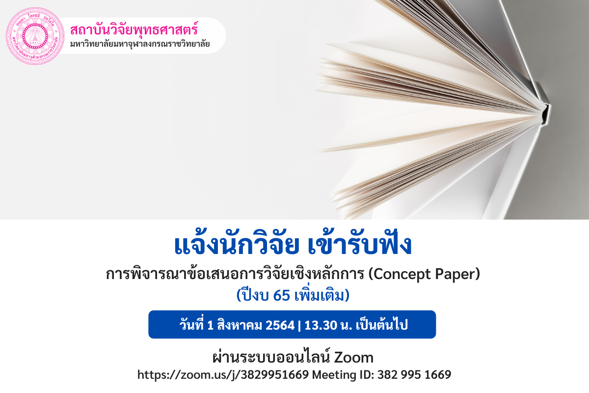แจ้งนักวิจัย ที่ส่ง Concept Paper ข้อเสนอการวิจัย ปีงบ 2565 (เพิ่มเติม) เข้ารับฟัง การพิจารณาข้อเสนอการวิจัยเชิงหลักการ (Concept Paper) (ออนไลน์) วันที่ 1 สิงหาคม 2564 | 13.30 น. ผ่านระบบ Zoom https://zoom.us/j/3829951669 Meeting ID: 382 995 1669