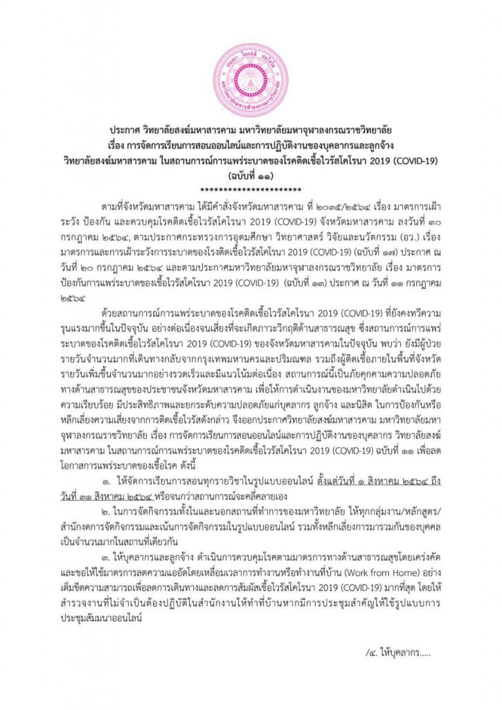 The post ประกาศ วิทยาลัยสงฆ์มหาสารคาม มหาวิทยาลัยมหาจุฬาลงกรณราชวิทยาลัย เรื่อง การจัดการเรียนการสอนออนไลน์และการปฏิบัติงานของบุคลากรและลูกจ้าง วิทยาลัยสงฆ์มหาสารคาม ในสถานการณ์การแพร่ระบาดของโรคติดต่อเชื้อไวรัสโคโรนา 2019(COVID-19) (ฉบับที่ ๑๑) appeared first on วิทยาลัยสงฆ์มหาสารคาม.