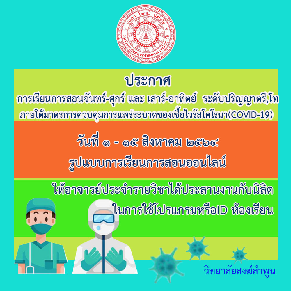 ถึง ๑๕ สิงหาคม ๒๕๖๔….ด้วยความห่วงใยด้านสุขภาพ หากนิสิตท่านใดที่เป็นกลุ่มเสี่ยง หรืออยู่ในภาวะการติดเชื้อไวรัสโควิด แต่ยังไม่ได้รับการช่วยเหลือจากหน่วยงานอื่น ให้รีบติดต่ออาจารย์ที่ปรึกษาหรือทางมหาวิทยาลัย ทางเราจะหาแนวทางและร่วมกันให้ความช่วยเหลือ