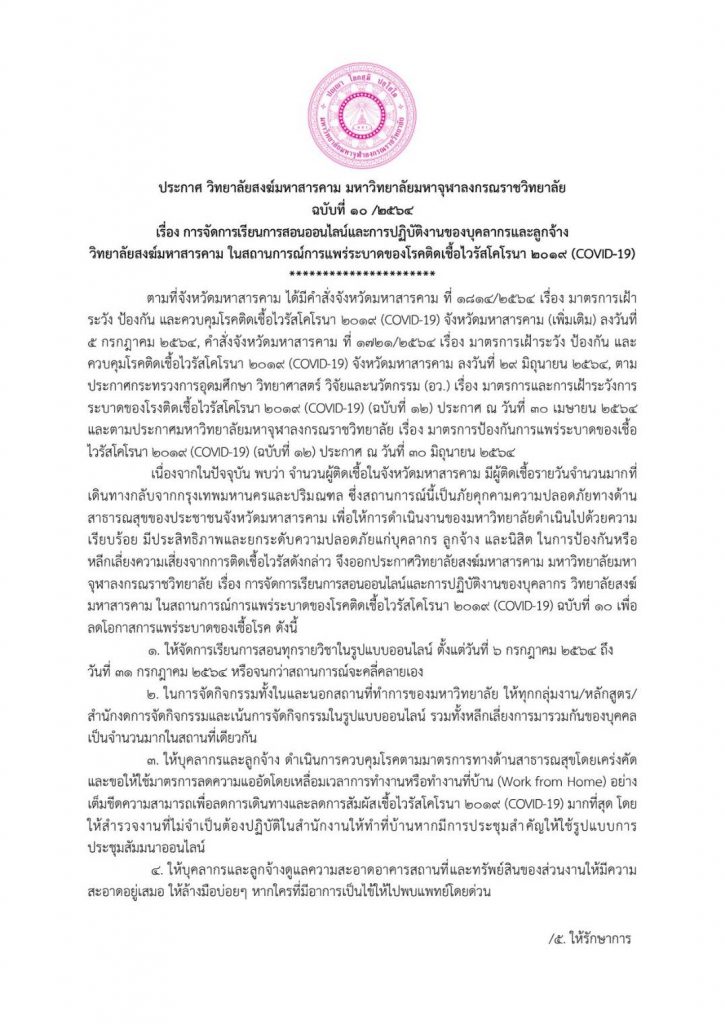 The post ประกาศ วิทยาลัยสงฆ์มหาสารคาม มหาวิทยาลัยมหาจุฬาลงกรณราชวิทยาลัย ฉบับที่ ๑๐ /๒๕๖๔ เรื่อง การจัดการเรียนการสอนออนไลน์และการปฏิบัติงานของบุคลากรและลูกจ้าง วิทยาลัยสงฆ์มหาสารคาม ในสถานการณ์การแพร่ระบาดของโรคติดเชื้อไวรัสโคโรนา ๒๐๑๙ (COVID-19) appeared first on วิทยาลัยสงฆ์มหาสารคาม.