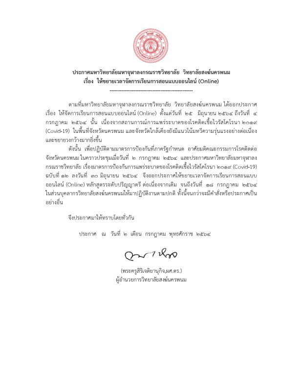 วิทยาลัยสงฆ์สุราษฎร์ธานี โดย พระปลัดนิคม ปญฺญาวชิโร อาจารย์วิทยาลัยสงฆ์สุราษฎร์ธานี และพระมหาศราวุธ สราวุโธ เดินทางวางพวงหรีดร่วมไว้อาลัยต่อการจากไปของนายสงกรานต์ ศรีกระจ่าง อายุ 25 ปี น้องชายของนางสาวแก้วนภา สุวรรณกุลไพศาล นิสิตชั้นปีที่ 1 สาขาวิชารัฐประศาสนศาสตร์ บำเพ็ญกุศลศพ ณ วัดสุนทรนิวาส (วัดประดู่) ตำบลวัดประดู่ อำเภอเมืองฯ จังหวัดสุราษฎร์ธานี กำหนดฌาปนกิจ ในวันพุธที่ 7 กรกฎาคม 2564 ซึ่งในวันอังคารที่ 6 กรกฎาคม 2564 ทางคณาจารย์และนิสิตจะเดินทางไปร่วมบำเพ็ญกุศลศพในวันดังกล่าวอีกครั้ง