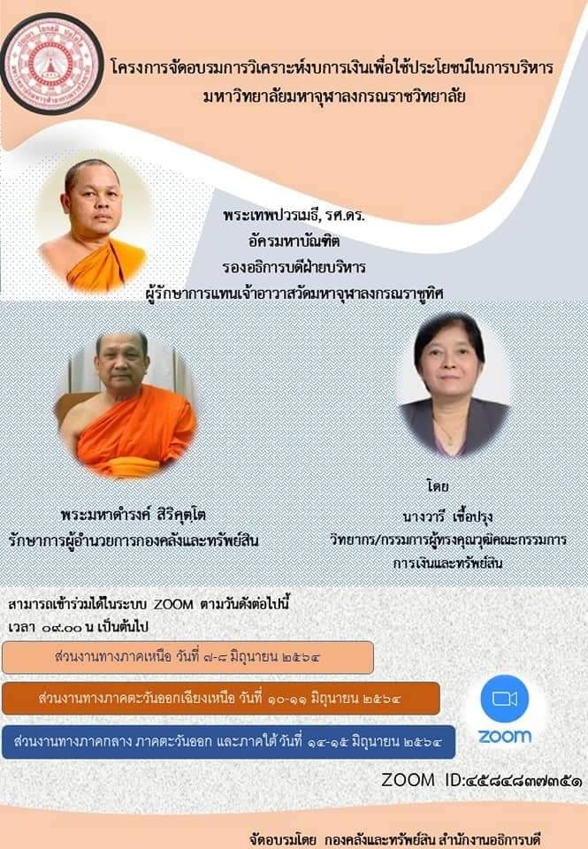 วันศุกร์ที่ ๑๑ มิถุนายน พ.ศ.๒๕๖๔ เวลา ๐๙.๐๐ น. นางสาวพิมวดี คำมูล ผู้อำนวยการสำนักงานวิทยาลัย, นางสาววัชราภรณ์ เสนาราษฎร์ นักวิชาการเงินและบัญชี(ปฏิบัติงานด้านพัสดุ), นางคำกอง ฮาดภักดี นักวิชาการเงินและบัญชี ได้เข้าร่วมโครงการอบรมวิเคราะห์งบการเงินเพื่อใช้ประโยชน์ในการบริหาร มหาวิทยาลัยมหาจุฬาลงกรณราชวิทยาลัย นำโดย พระเทพปวรเมธี, รศ.ดร. รองอธิการบดีฝ่ายบริหาร มหาวิทยาลัยมหาจฬาลังกรณราชวิทยาลัย ผู้รักษาการแทนเจ้าอาวาสวัดมหาจุฬาลงกรณราชูทิศ, พระมหาดำรงค์ สิริคุตฺโต รักษาการผู้อำนวยการกองคลังและทรัพย์สิน, นางวารี เชื้อปรุง วิทยากร/กรรมการผู้ทรงคุณวุฒิคณะกรรมการ การเงินและทรัพย์สิน ผ่านระบบ Zoom
