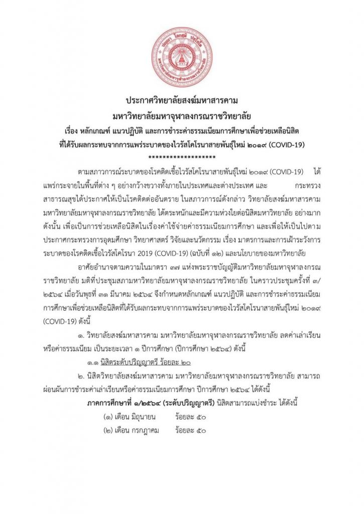 The post ประกาศ วิทยาลัยสงฆ์มหาสารคาม มหาวิทยาลัยมหาจุฬาลงกรณราชวิทยาลัย เรื่อง หลักเกณฑ์ แนวปฏิบัติ และการชำระค่าธรรมเนียมการศึกษาเพื่อช่วยเหลือนิสิต ที่ได้รับผลกระทบจากการแพร่ระบาดของไวรัสโคโรน่าสายพันธุ์ใหม่ 2019(COVID-19) appeared first on วิทยาลัยสงฆ์มหาสารคาม.