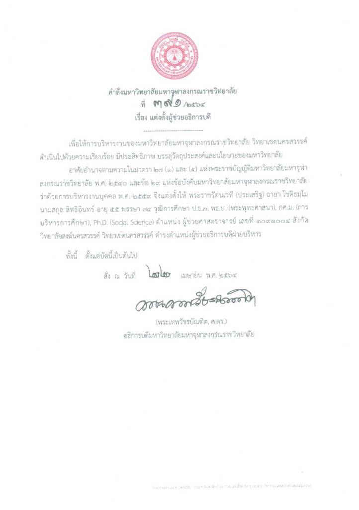 แต่งตั้งผู้ช่วยอธิการบดี เพื่อให้การบริหารงานของมหาวิทยาลัยมหาจุฬาลงกรณราชวิทยาลัย วิทยาเขตนครสวรรค์ ดำเนินไปด้วยความเรียบร้อย มีประสิทธิภาพ บรรลุวัตถุประสงค์และนโยบายของมหาวิทยาลัย อาศัยอำนาจตามความในมาตรา ๒๗ (๑ และ (๔) แห่งพระราชบัญญัติมหาวิทยาลัยมหาจุฬาลงกรณราชวิทยาลัย พ.ศ. ๒๕๔- และข้อ ๒๙ แห่งข้อบังคับมหาวิทยาลัยมหาจุฬาลงกรณราชวิทยาลัย