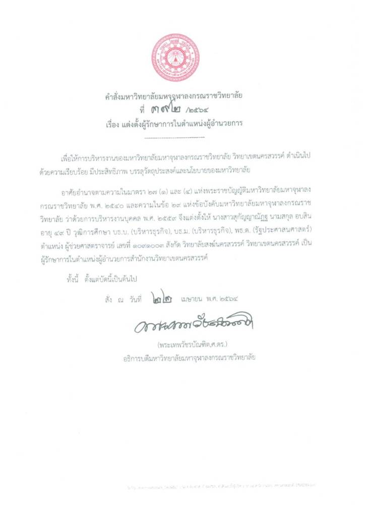 แต่งตั้งผู้รักษาการในตำแหน่งผู้อำนวยการ เพื่อให้การบริหารงานของมหาวิทยาลัยมหาจฬาลงกรณราชวิทยาลัย วิทยาเขตนครสวรรค์ ดำเนินไปด้วยความเรียบร้อย มีประสิทธิภาพ บรรลุวัตถุประสงค์และนโยบายของมหาวิทยาลัย อาศัยอำนาจตามความในมาตรา ๒๗ (๑) และ (๔) แห่งพระราชบัญญัติมหาวิทยาลัยมหาจุฬาลงกรณราชวิทยาลัย พ.ศ. ๒๕๔- และความในข้อ ๒๙ แห่งข้อบังคับมหาวิทยาลัยมหาจุฬาลงกรณราชวิทยาลัย