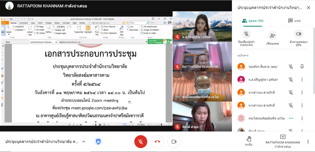 วันอังคารที่ ๑๑ พฤษภาคม ๒๕๖๔ เวลา ๑๔.๐๐ น. สำนักงานวิทยาลัย วิทยาลัยสงฆ์มหาสารคาม ได้จัดประชุมบุคลากรประจำสำนักงานวิทยาลัย วิทยาลัยสงฆ์มหาสารคาม ครั้งที่ ๕/๒๕๖๔ ผ่านระบบออนไลน์ Google meeting นำโดย พระโสภณพัฒนบัณฑิต, รศ.ดร. รักษาการผู้อำนวยการวิทยาลัยสงฆ์มหาสารคาม ได้เมตตาเป็นประธานในการประชุม โดยการประชุมในครั้งนี้ แต่ละส่วนงานในสำนักงานวิทยาลัย วิทยาลัยสงฆ์มหาสารคาม ได้รายงานผลการดำเนินงานในรอบวันที่ ๒๑ เมษายน – ๑๐ พฤษภาคม พ.ศ.๒๕๖๔ และได้รับฟังข้อปฏิบัติ ในการปฏิบัติงาน เพื่อให้บรรลุวัตถุประสงค์ในการทำงาน จากประธานในการประชุม พร้อมรับฟังข้อเสนอแนะจากผู้บริหารสำนักงานวิทยาลัย พระมหาประกาศ อาภากโร รักษาการรองผู้อำนวยการฝ่ายบริหาร และ นางสาวพิมวดี คำมูล ผู้อำนวยการสำนักงานวิทยาลัย เพื่อนำข้อเสนอแนะไปปรับใช้ในการทำงาน ให้มีประสิทธิภาพมากยิ่งขึ้น