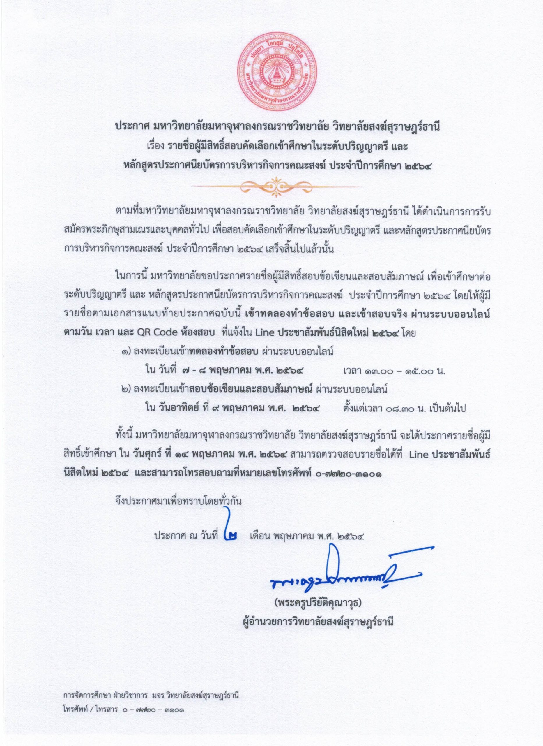ประกาศแจ้งหลักสูตรจัดการสอบเข้า